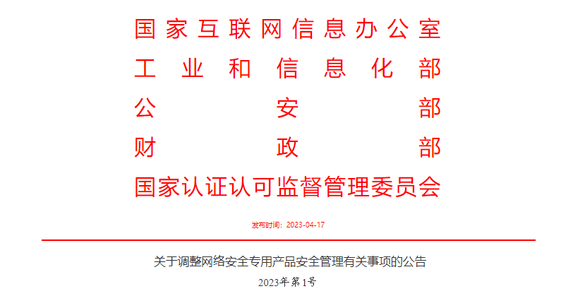 關(guān)于調(diào)整網(wǎng)絡(luò)安全專用產(chǎn)品安全管理有關(guān)事項(xiàng)的公告